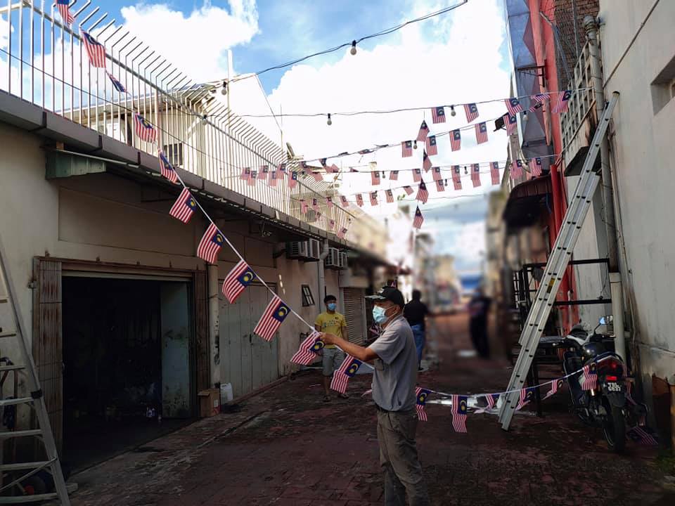 随着国庆日即将到来,为了感受国庆气氛,志工们齐心协力把后巷布置起来,挂上许多小国旗随风飘扬。