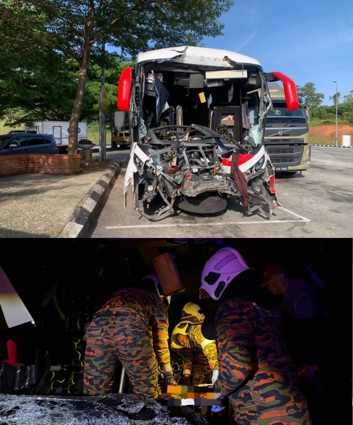 (古来9日讯)长途巴士于凌晨时分,猛撞油槽罗厘后方,造成车头严重损坏,车内至少12名乘客受伤。