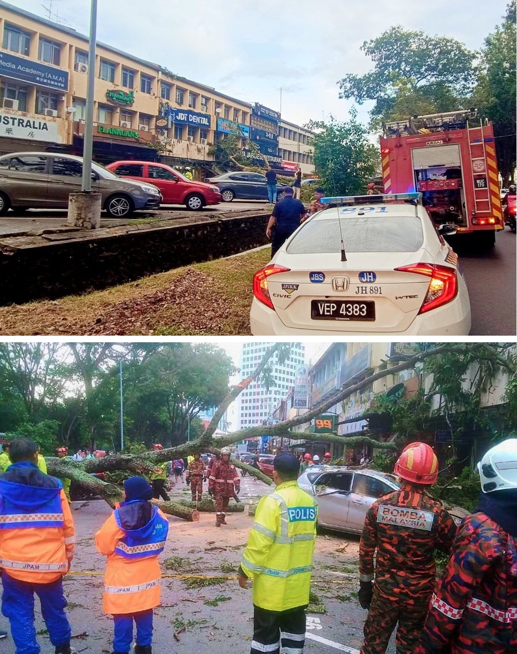 这宗树倒事件于今午4时许,在新山彩虹花园的黄路(Jalan Kuning)发生。