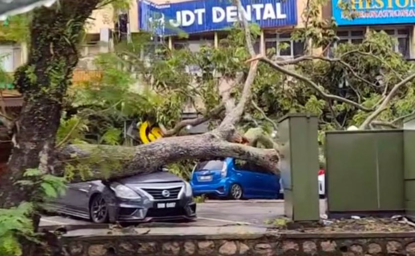 至于新山南警区文告指出,大树倒下压中5辆轿车,包括 Honda City、Perodua Myvi、Nissan Almera、Toyota Vios和Proton X70。