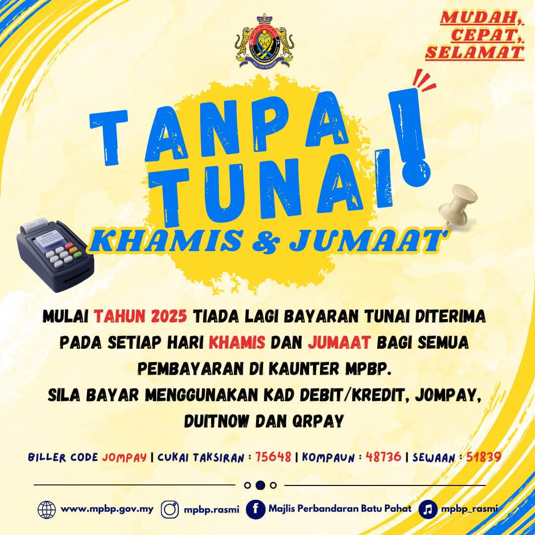 (峇株巴辖16日讯)峇株巴辖市议会迈向“无现金支付”社会,今年起每逢周四和五,柜台不再收取现金。