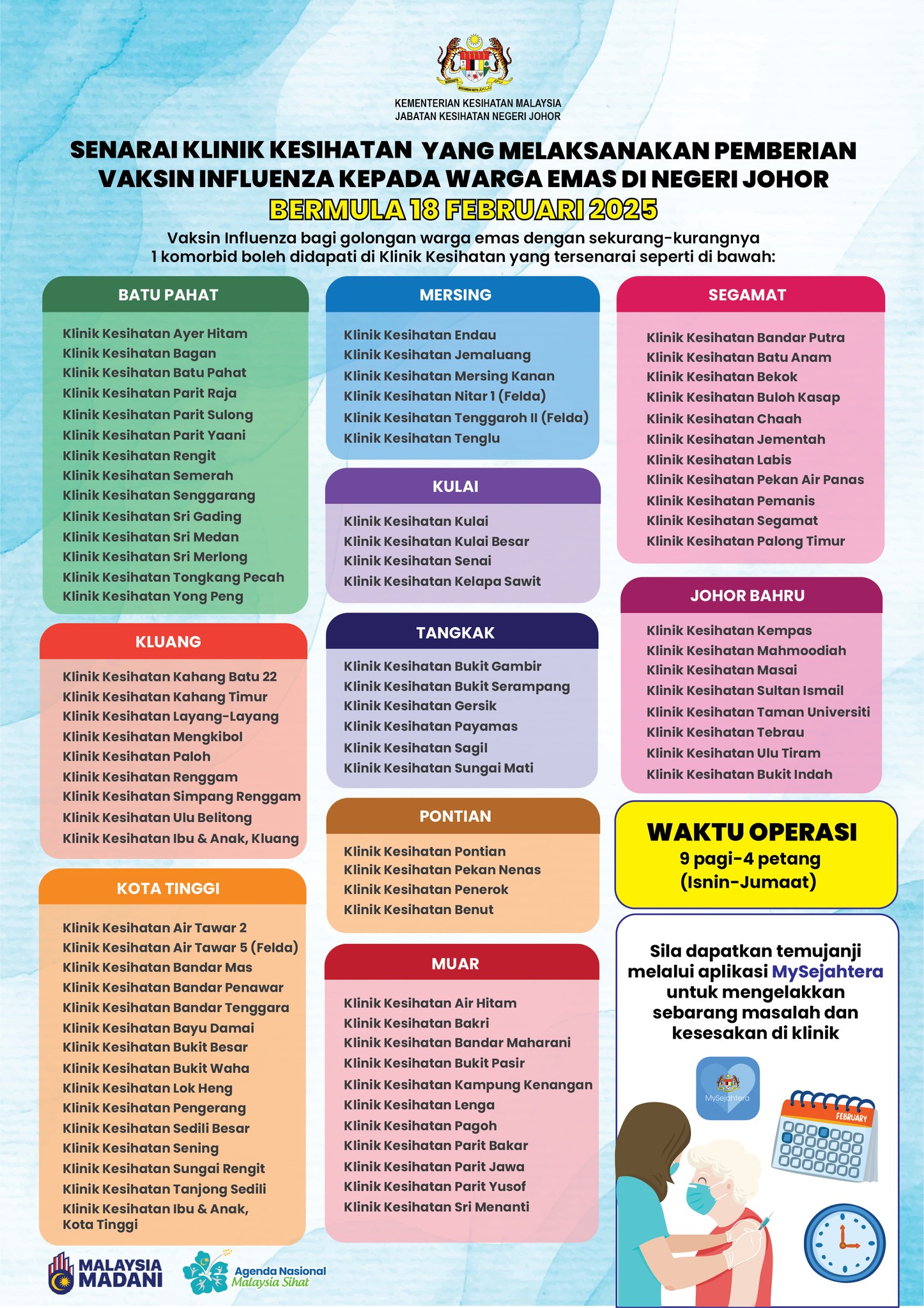 柔佛卫生局分享了州内提供流感疫苗接种的政府诊所,多达80多家,并提醒民众可以使用“My Sejahtera”应用程式预约。步骤如下:
